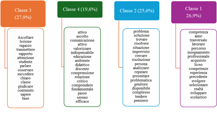 Per quel che concerne il primo aspetto, riportando le frequenze assolute del loro utilizzo, le prime dieci voci maggiormente ricorrenti sono state: ascolto (116); cercare (107); comunicazione (95); ragazzo (95); ascoltare (91); alunno (90); problema (88); attivo (88); studente (78); esperienza (76).