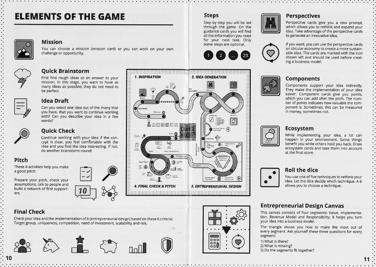 Basato sul modello TRIO di Lindner (2018; 2019), il gioco da tavolo The Next Generation of Change Makers è stato concepito per sviluppare le competenze imprenditoriali alllordi base; si radica nei principi del change making e della sostenibilità ambientale, incorporando così i principi dell’imprenditorialità sociale e sostenibile. Il gioco, che utilizza carte e istruzioni sia in lingua tedesca che inglese, si articola in quattro fasi come illustrato da Figura 1 (al centro il tabellone).