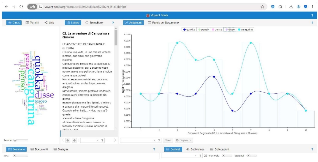 A livello metodologico, lo studio ha utilizzato come tecnica principale il text mining, ossia l’analisi del discorso e l’analisi quali-quantitativa del contenuto del corpus composto dai testi delle 54 fiabe prodotte al Laboratorio di Pedagogia speciale tra novembre 2023 e luglio 2024, tramite il sistema open source e web-based Voyant, per la lettura e analisi computazionale, sviluppato da Stéfan Sinclair (McGill University) e Geoffrey Rockwell (Università di Alberta).